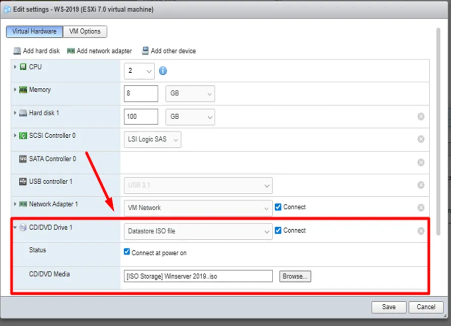 Sau khi có tệp tin ISO, bạn cần thực hiện cấu hình phần cứng ảo trên VMware ESXi hoặc Workstation.