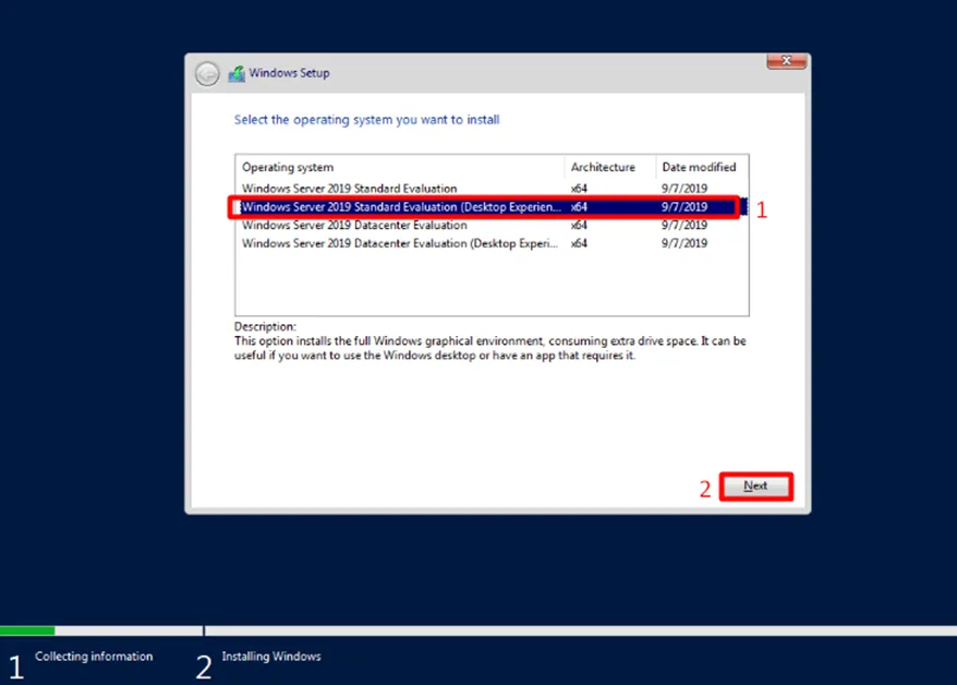 Đối với hầu hết nhu cầu quản trị thông thường, hãy chọn Windows Server 2019 Standard Evaluation (Desktop Experience) rồi nhấn Next.