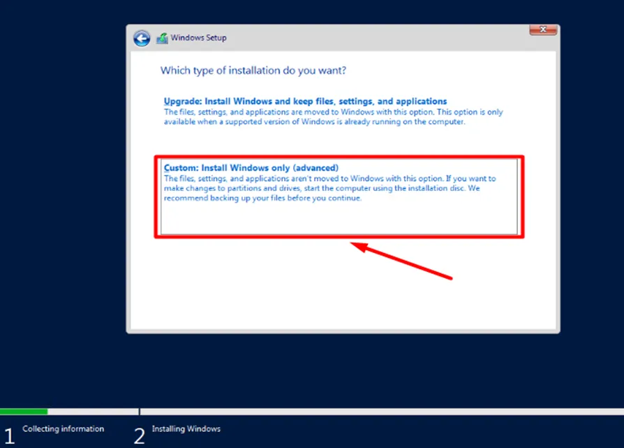 - Chọn kiểu cài đặt: Custom: Install Windows only (advanced). Kiểu “Upgrade” chỉ dành cho việc nâng cấp từ phiên bản cũ hơn.
