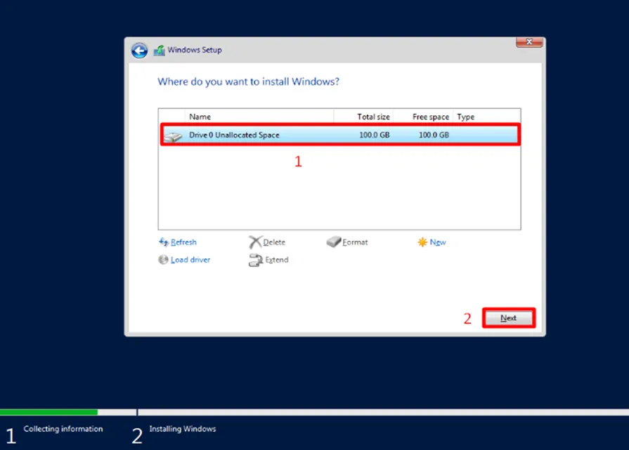 - Chọn phân vùng ổ cứng (thường là Unallocated Space). Tại đây bạn có thể chia thêm phân vùng nếu cần bằng nút “New”, nếu không hãy để mặc định và nhấn Next.