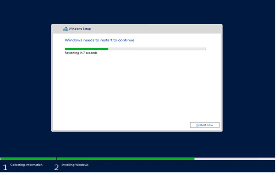 - Hệ thống sẽ tự động thực hiện quá trình sao chép tệp, cài đặt tính năng và các bản vá lỗi (updates). Quá trình này nhanh hay chậm phụ thuộc vào tốc độ ổ cứng (SSD/NVMe) của máy chủ vật lý.