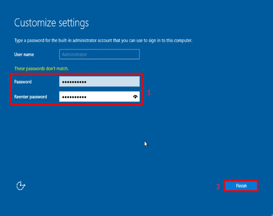 - Thiết lập tài khoản quản trị: Điền mật khẩu cho tài khoản Administrator. Mật khẩu phải đáp ứng tiêu chuẩn an toàn: tối thiểu 8 ký tự, bao gồm chữ hoa, chữ thường, số và ký tự đặc biệt. Nhấn Finish.