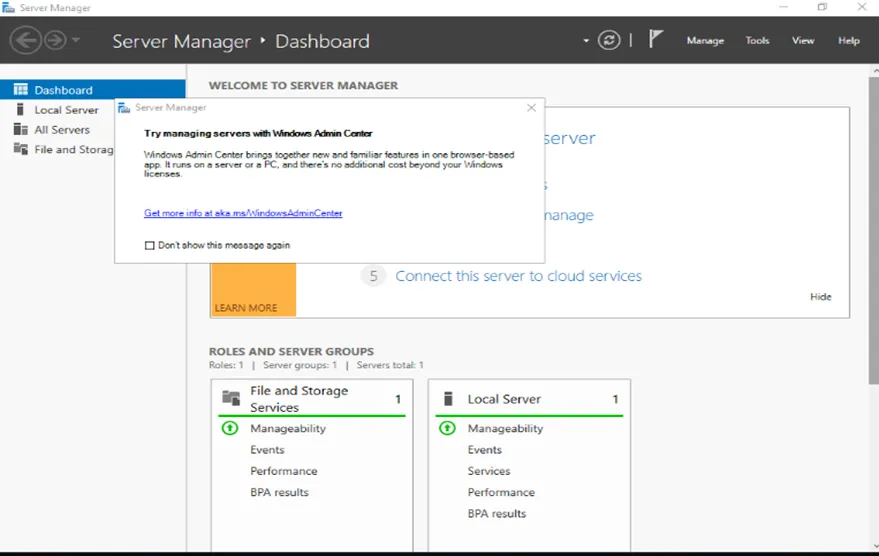 - Giao diện Server Manager sẽ tự động khởi chạy. Đây chính là “trung tâm điều khiển” giúp bạn quản lý các vai trò (Roles) và tính năng (Features) của máy chủ.