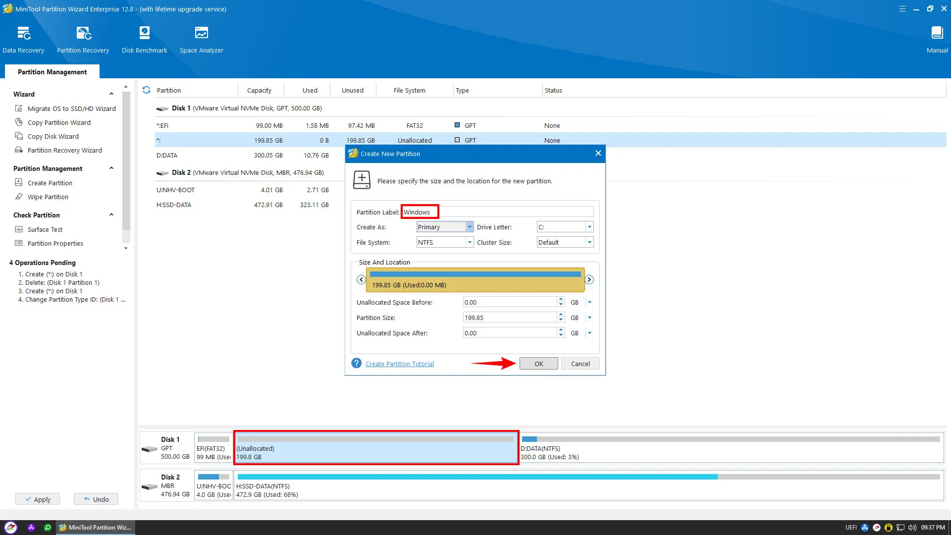 Phần dung lượng còn lại, bạn tiếp tục chọn “Create”, đặt tên là “Windows” và chọn định dạng NTFS. Đây sẽ là nơi cài đặt hệ điều hành chính.
