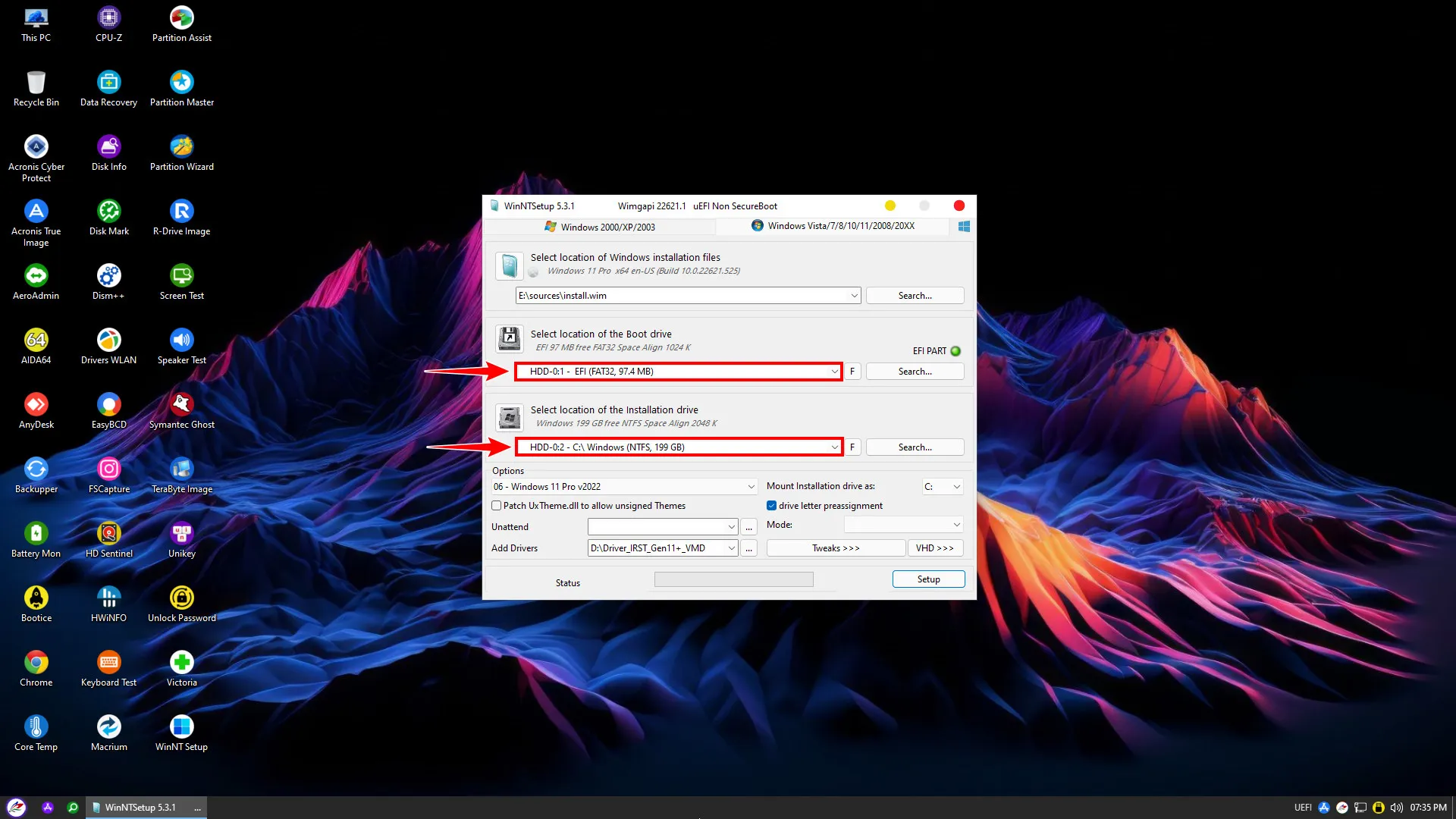 - Boot drive: Bạn nhấn “Search” và chọn phân vùng EFI (FAT32) 100MB đã tạo ở bước trên.