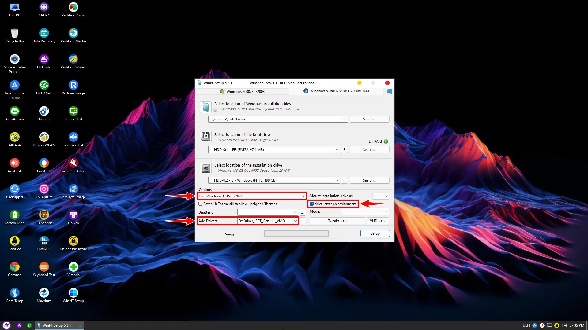 Sau khi đã có phân vùng chuẩn, bạn hãy tắt Partition Wizard và mở công cụ WinNTSetup lên. Giao diện của công cụ này rất trực quan nếu bạn hiểu rõ ý nghĩa của 3 dòng lựa chọn chính.
