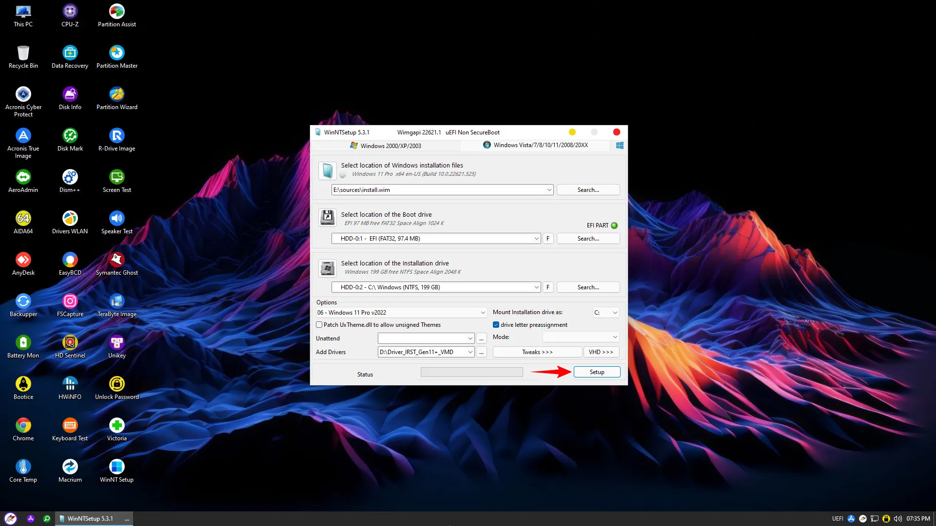 Sau khi kiểm tra kỹ các thông số bạn nhấn nút Setup